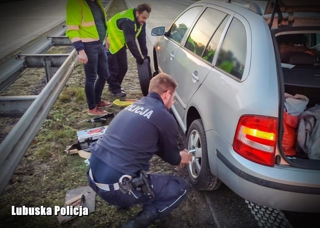 Na miejsce szybko dotarł patrol drogówki ze świebodzińskiej komendy. Po chwili do pomocy w zabezpieczeniu dotarł również patrol służb drogowych obsługi autostrady, który oznakował otoczenie, dodatkowo je zabezpieczając. Ponieważ czas oczekiwania na dojazd pojazdu pomocy drogowej okazał się zbyt długi, policjanci zdecydowali, że sami pomogą usunąć usterkę i przykręcili koło uszkodzonego samochodu.