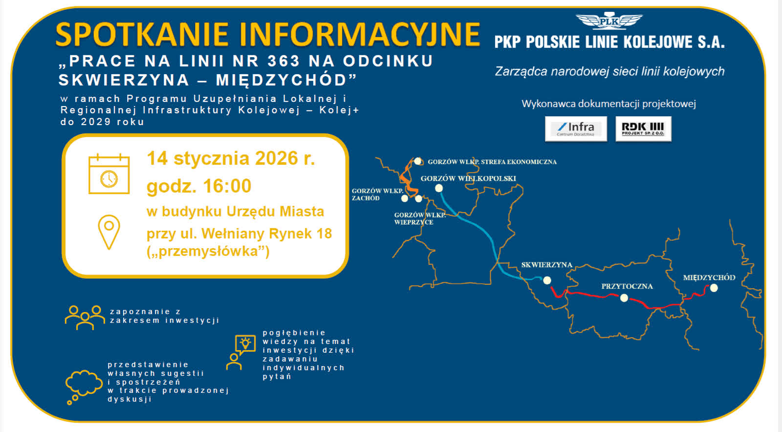 Spotkanie, na które zapraszają PKP Polskie Linie Kolejowe S.A., odbędzie się 14 stycznia 2026 r. o godz. 16.00 w sali konferencyjnej Urzędu Miasta, przy ul. Wełniany Rynek 18, czyli na 9. piętrze dawnej „Przemysłówki”.