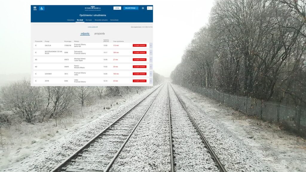 W związku z wydanymi przez IMiGW ostrzeżeniami pogodowymi dotyczącymi wystąpienia możliwych intensywnych opadów śniegu, niskich temperatur, oblodzeń oraz silnego wiatru mogą wystąpić utrudnienia i opóźnienia pociągów. Przed planowaniem podróży zaleca się sprawdzenie rozkładu jazdy oraz zapoznanie się z ewentualnymi zmianami w kursowaniu pociągów
