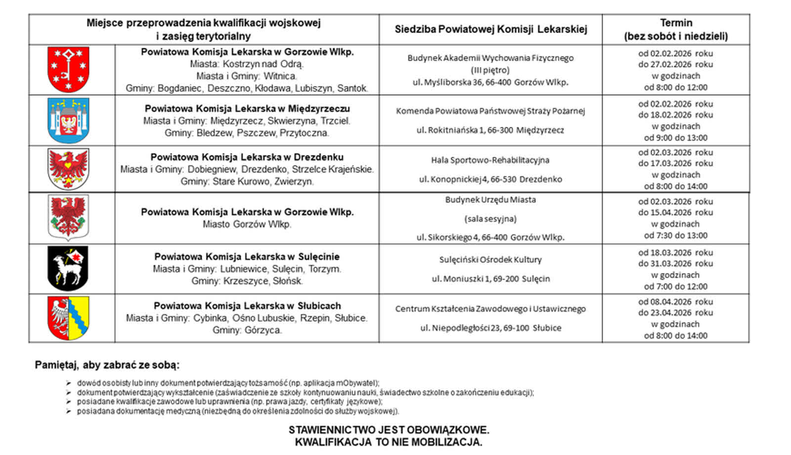 W poniedziałek rozpoczyna się kwalifikacja wojskowa w naszym regionie. Jako pierwsi przed komisją staną młodzi ludzie z powiatów: gorzowskiego oraz międzyrzeckiego.