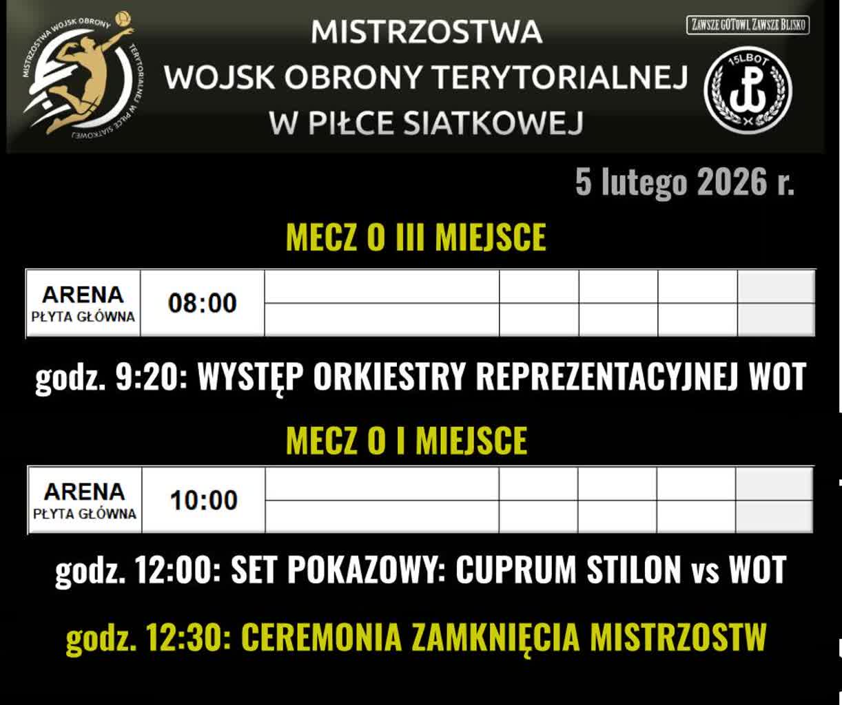 W czwartek zakończenie mistrzostw. O godz. 8:00 w Arenie Gorzów zostanie rozegrany mecz o trzecie miejsce, o 9.20 zaplanowano koncert orkiestry reprezentacyjnej WOT, o 10:00 mecz o 1 miejsce, a w samo południe set pokazowy w którym reprezentacja WOT zmierzy się z zespołem Cuprum Stilonu Gorzów. Wstęp na trybuny Areny jest bezpłatny.
