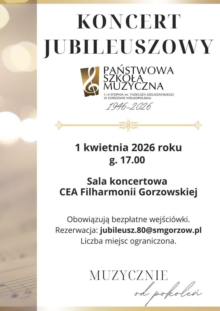Bezpłatne wejściówki na koncert jubileuszowy Państwowej Szkoły Muzycznej można rezerwować wysyłając email na adres; jubileusz.80@smgorzow.pl