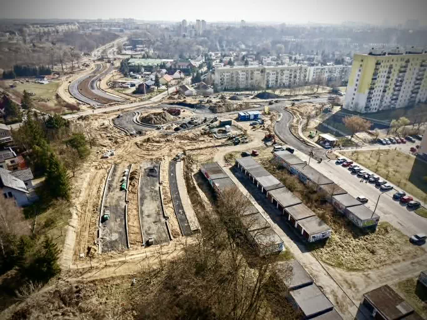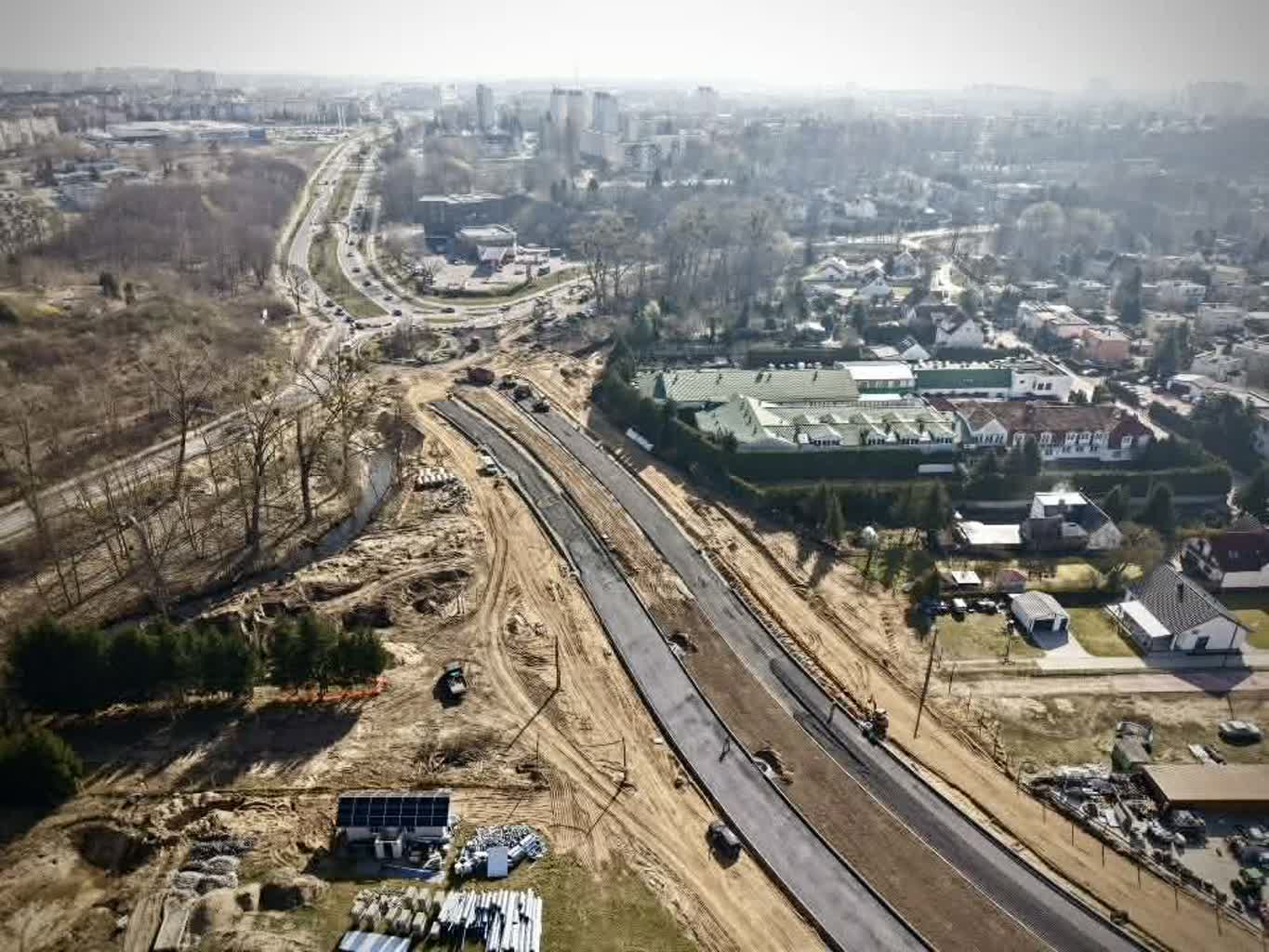 Dokładnie widać już kształt pierwszego odcinka północnej obwodnicy Gorzowa i pierwszego ronda, które powstaje w ramach tego zadania. Czarne pasy wyraźnie odbijają się na tle ziemistego podłoża. – To jeszcze nie asfalt – mówi kierownik budowy Przemysław Ptak i dodaje, że do tego etapu wkrótce dojdziemy: