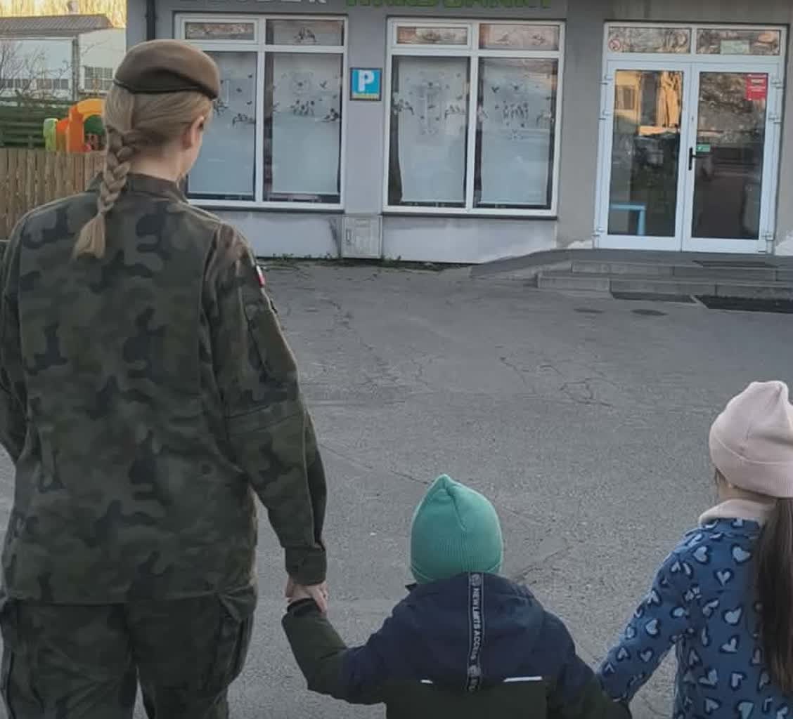 Szeregowy Izabela Fortuniak z 15 Lubuskiej Brygady Obrony Terytorialnej, w mundurze odprowadzała dziś dzieci do żłobka i przedszkola: